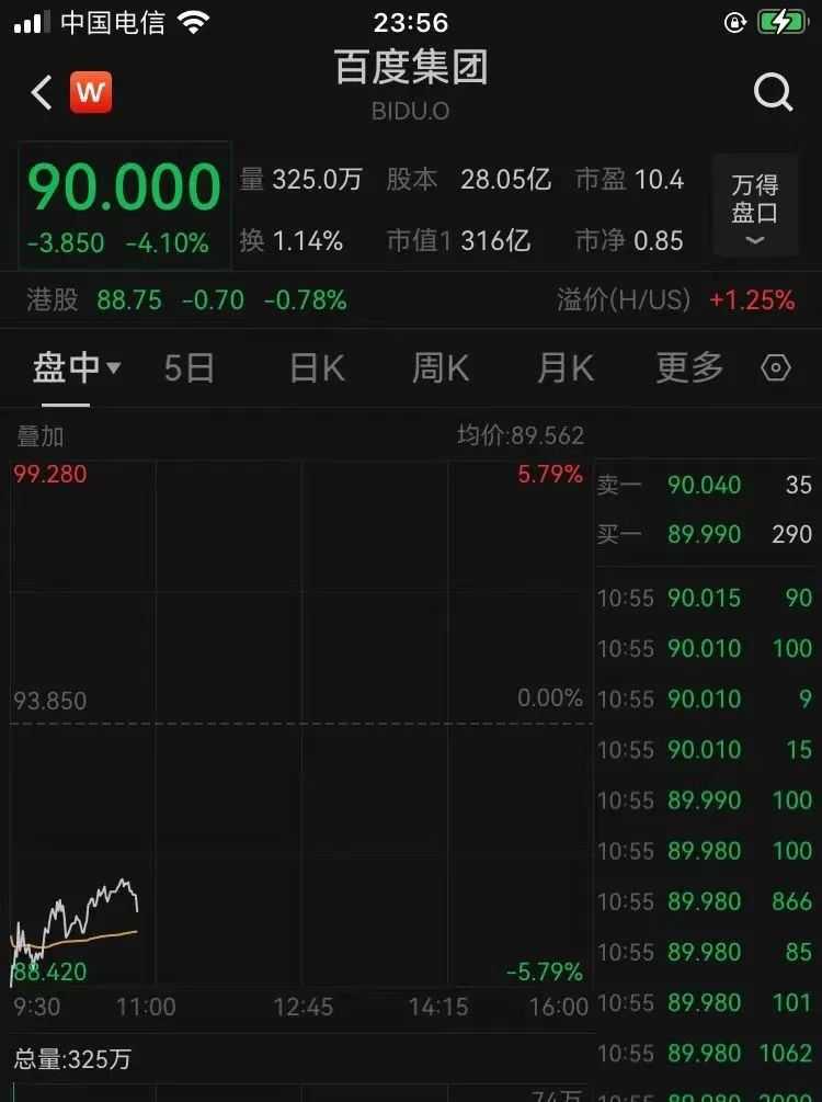 百度集团盘前下跌4%,开盘后截至发稿,下跌4.1%。