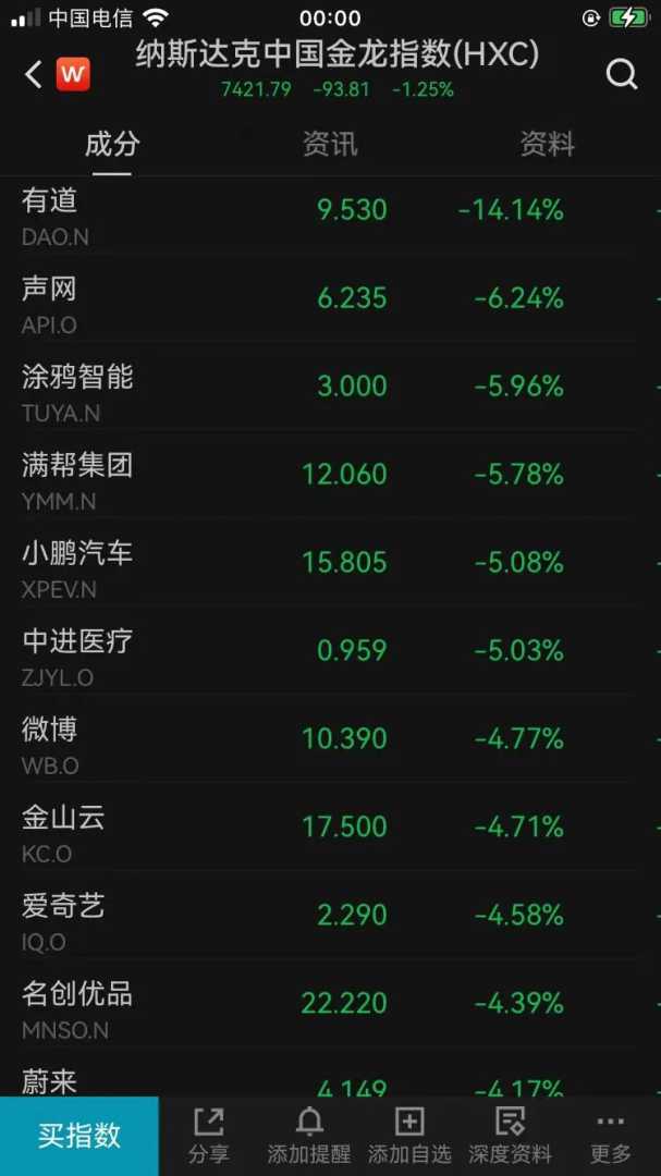 盘面上,中概股多数下跌,纳斯达克中国金龙指数一度跌超2%。有道大跌逾14%,小鹏汽车跌超5%。