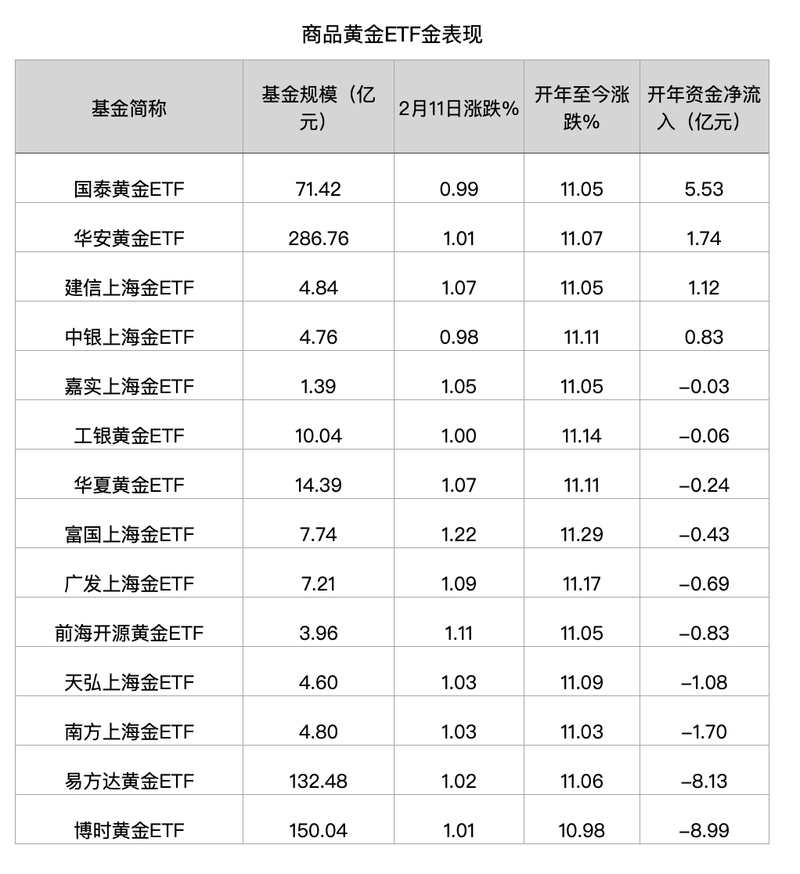 作为金价放大器的黄金股,同样表现亮眼。2月11日,大盘收跌,而黄金珠宝指数逆势上涨2.77%,黄金概念股多只个股涨停或大涨。ETF层面,全市场20只黄金主题ETF全线收涨,明显放量。开年以来,黄金涨势凶猛,已经八次创下了新高,至今已涨超11%。不过,资金却开始止盈,呈净流出状态。