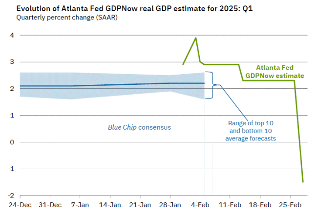 亚特兰大联储GDPNow模型周五更新数据显示,美国一季度经济预计将萎缩1.5%。若此预测成真,这将是自2022年第一季度以来,美国经济首次遭遇季度下滑。近期,一系列经济增长放缓的迹象出现,关于美国经济衰退的讨论愈演愈烈。