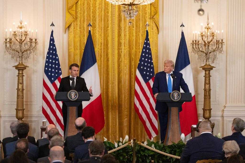 2月24日,美国总统特朗普(右)在华盛顿白宫与到访的法国总统马克龙举行会谈后的联合记者会。新华社记者胡友松摄