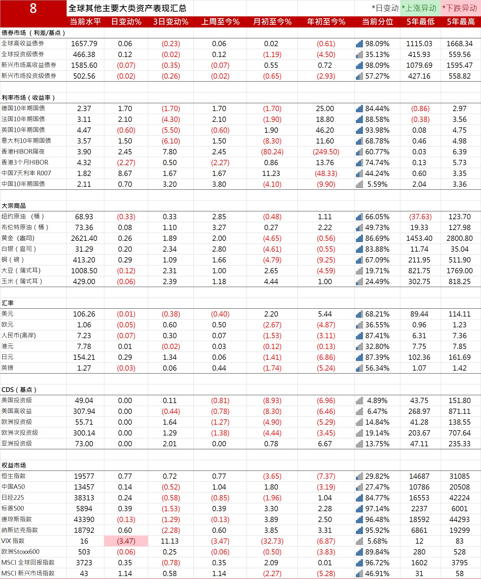 周一,美国国债市场扭转跌势,2年期与10年期国债收益率均下跌。欧洲债市受欧洲央行降息预期调整影响,德国国债收益率下滑,欧洲股市走低,英国国债收益率微跌。