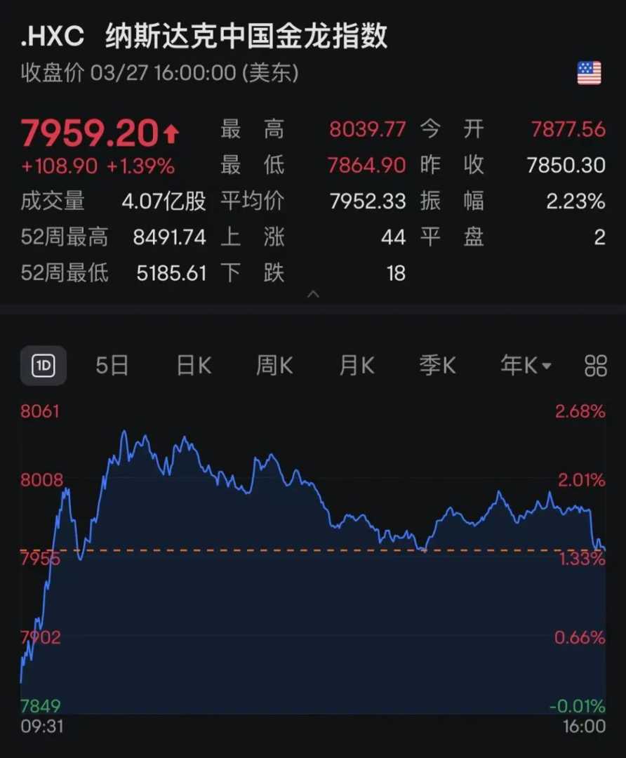 股市方面,3月27日美国三大股指一度翻红,但最终受多重因素影响跳水翻绿。道指、标普500指数和纳指均出现下跌。中概股方面,纳斯达克中国金龙指数一度涨逾2%,虽然受美股跳水拖累,但最终仍收涨。