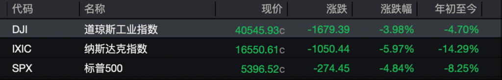 截至当地时间4月3日收盘,道指暴跌1679.39点,跌幅达3.98%,报收40545.93点,创2020年6月以来最大单日跌幅;标普500指数亦大幅下滑4.84%,报收5396.52点,同样创2020年6月以来最大单日跌幅;纳指更是重挫5.97%,报收16550.61点,刷新2020年3月以来最大单日跌幅。