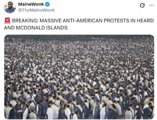 社交媒体截图帖文翻译:突发新闻:赫德岛和麦克唐纳群岛发生大规模反美抗议活动,企鹅被征税,是因为它没有说“谢谢”。