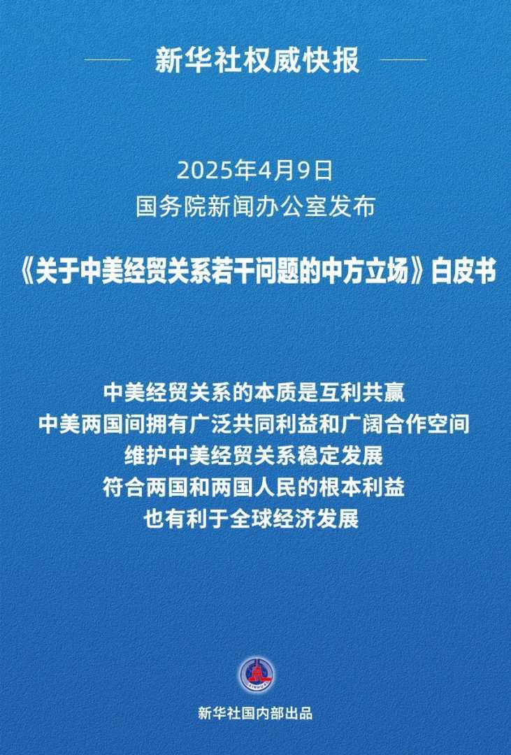 国务院新闻办公室4月9日发布《关于中美经贸关系若干问题的中方立场》白皮书,澄清中美经贸关系事实,明确中方对经贸摩擦的政策立场,强调互利共赢的本质。