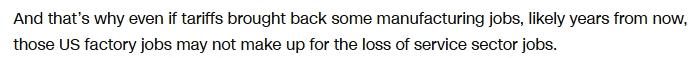文章指出,即便特朗普的关税政策能实现制造业回流,也无法弥补服务贸易领域可能因反制措施而流失的就业。