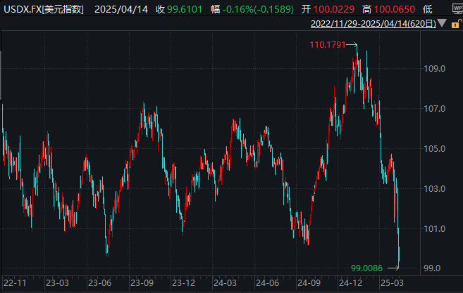 特朗普政府周末在电子产品关税方面的反复无常,导致美元指数进一步下挫。基金经理警告称,美元作为全球资本避风港的地位受到威胁。投资者对美元的信心下降,可能引发全面抛售美国资产的趋势。