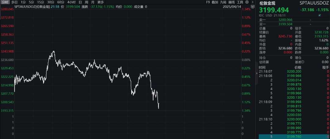 21:18 现货黄金跌破3200美元/盎司,市场避险情绪有所缓解。