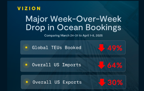 Vizion数据显示,4月1日至8日,全部预订标准箱数量环比大幅下跌49%,美国整体进口数量环比大幅下跌64%。
