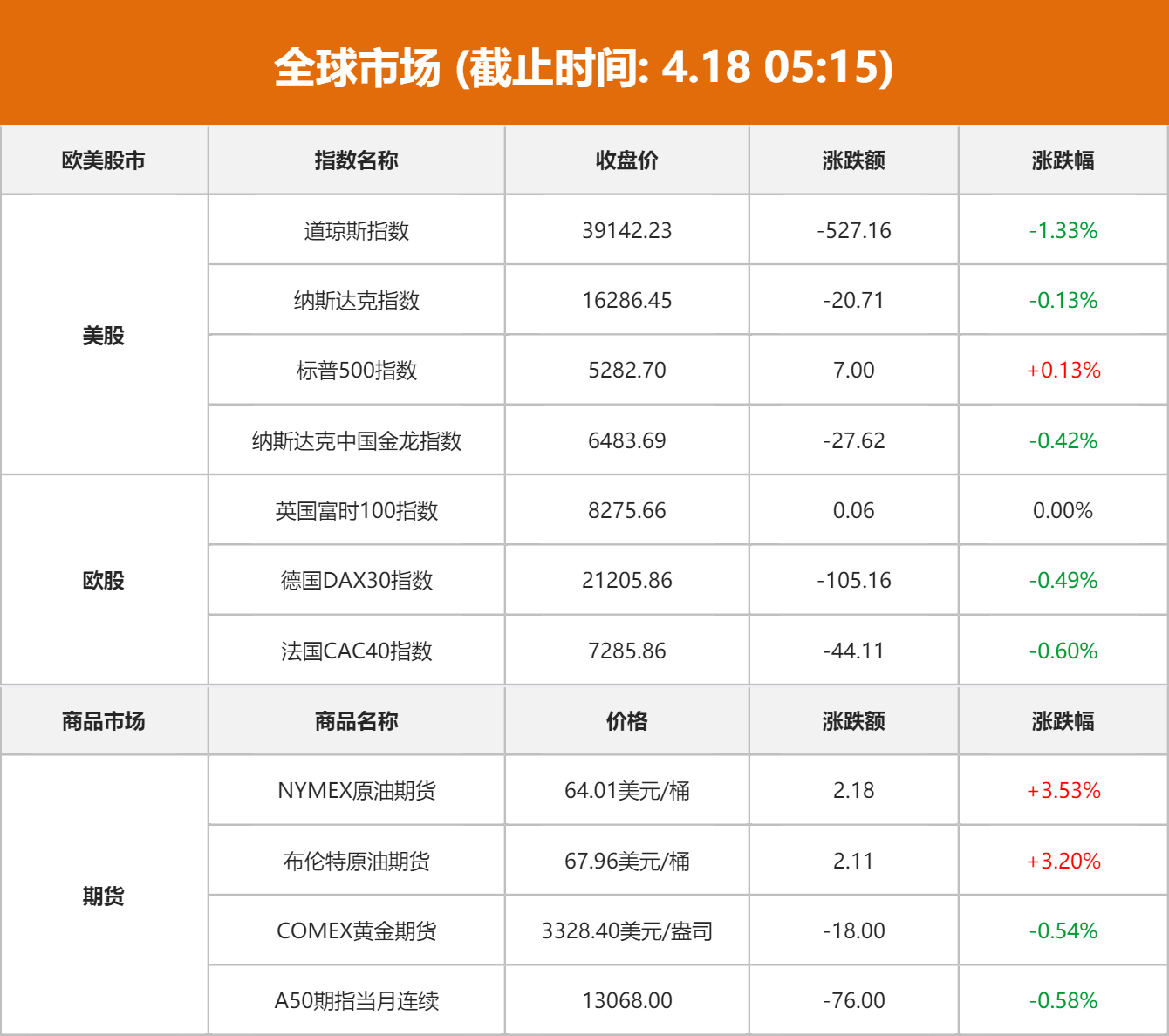 纽约股市三大股指涨跌不一,道琼斯工业平均指数下跌1.33%,标准普尔500种股票指数上涨0.13%,纳斯达克综合指数微跌。国际油价显著上涨,纽约商品交易所轻质原油期货价格上涨3.54%。欧洲股市涨跌互现。