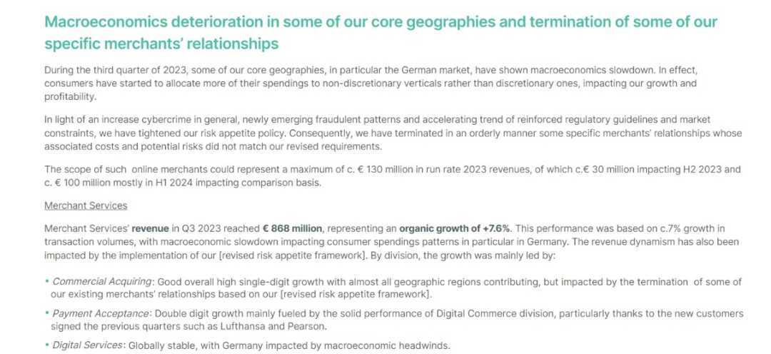 Worldline在财报中提到,三季度公司部分核心业务地区,特别是德国市场,出现了宏观经济放缓。受此影响,消费者更倾向于将资金用于非可自由支配的消费,而非可选消费品,这也影响了公司的利润增长。同时,网络犯罪的激增导致公司主动终止了一批不符合更严格风险偏好政策的商户。