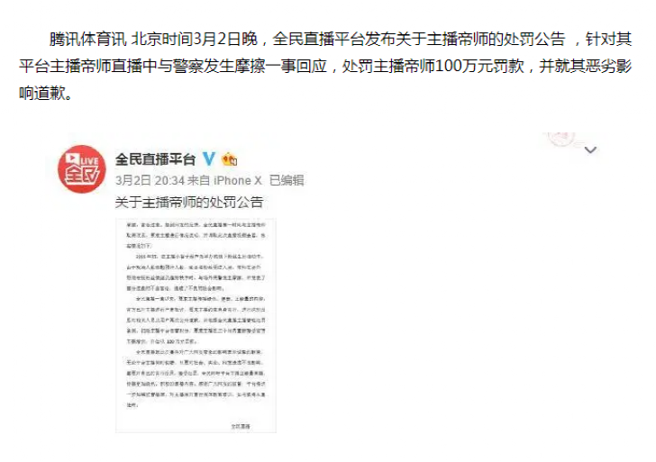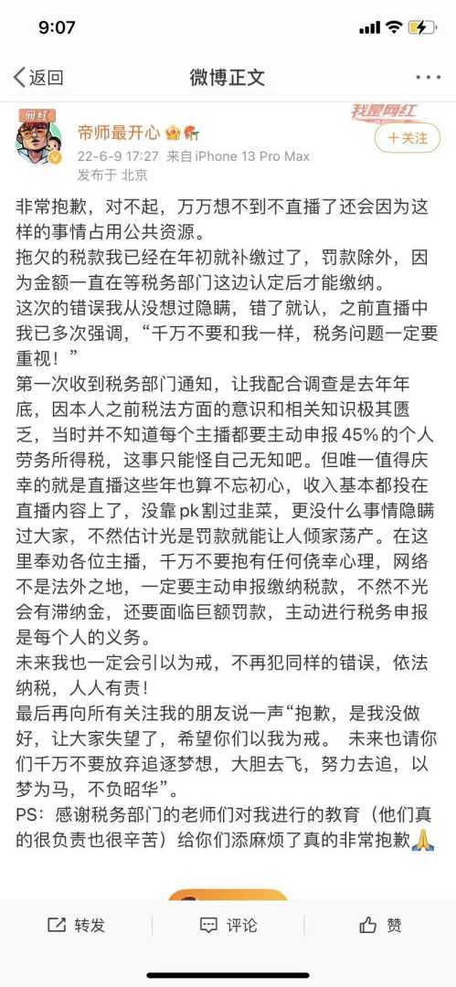 6月9日,偷税消息曝出后,相关话题迅速登上微博热搜榜。帝师也在微博公开回应道歉,并表示奉劝各位主播要依法纳税,不要抱有任何侥幸心理。他坦言自己之前对税法方面的意识和相关知识极其匮乏,不知道每个主播都要主动申报45%的个人劳务所得税,但现在已经认识到了错误。