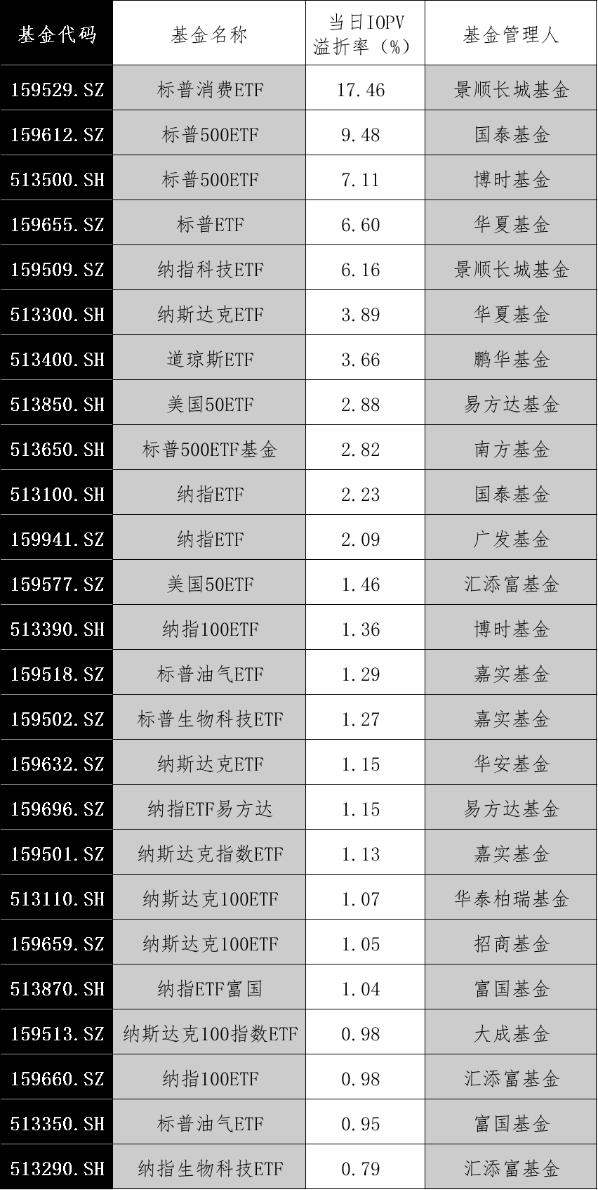 11月29日,标普500ETF单日涨幅达1.68%,标普生物科技ETF、标普油气ETF、纳指科技ETF等也涨幅居前。同时,多只跨境ETF出现高溢价情况,其中标普消费ETF溢折率高达17.46%,创当前最高纪录。国泰基金、博时基金、华夏基金、景顺长城基金等旗下多只跨境ETF溢折率均在6%以上,显示出市场供不应求的态势。