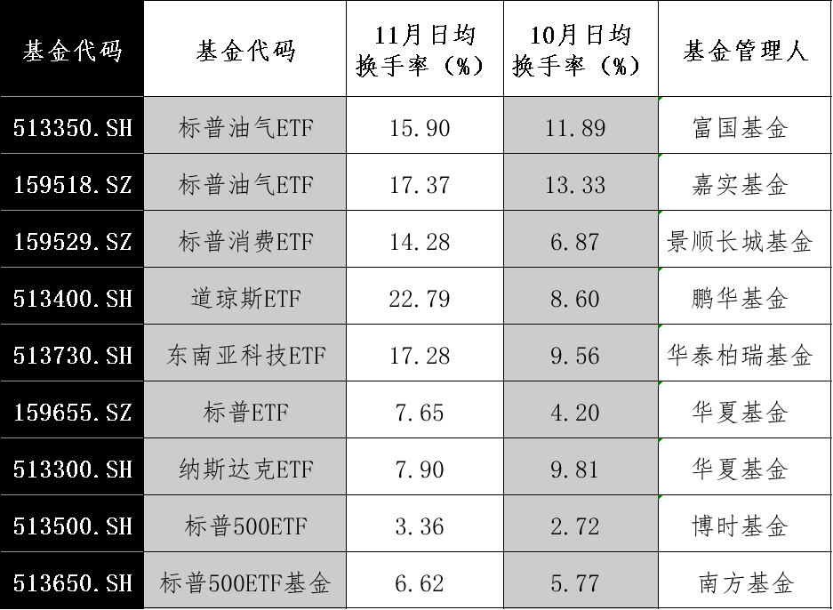 此外,跨境ETF的交易活跃度也明显提升。以日均换手率为例,东方财富Choice数据显示,多只跨境ETF11月份日均换手率高于10月份。标普消费ETF、标普油气ETF、道琼斯ETF等基金的换手活跃度均有显著提升。