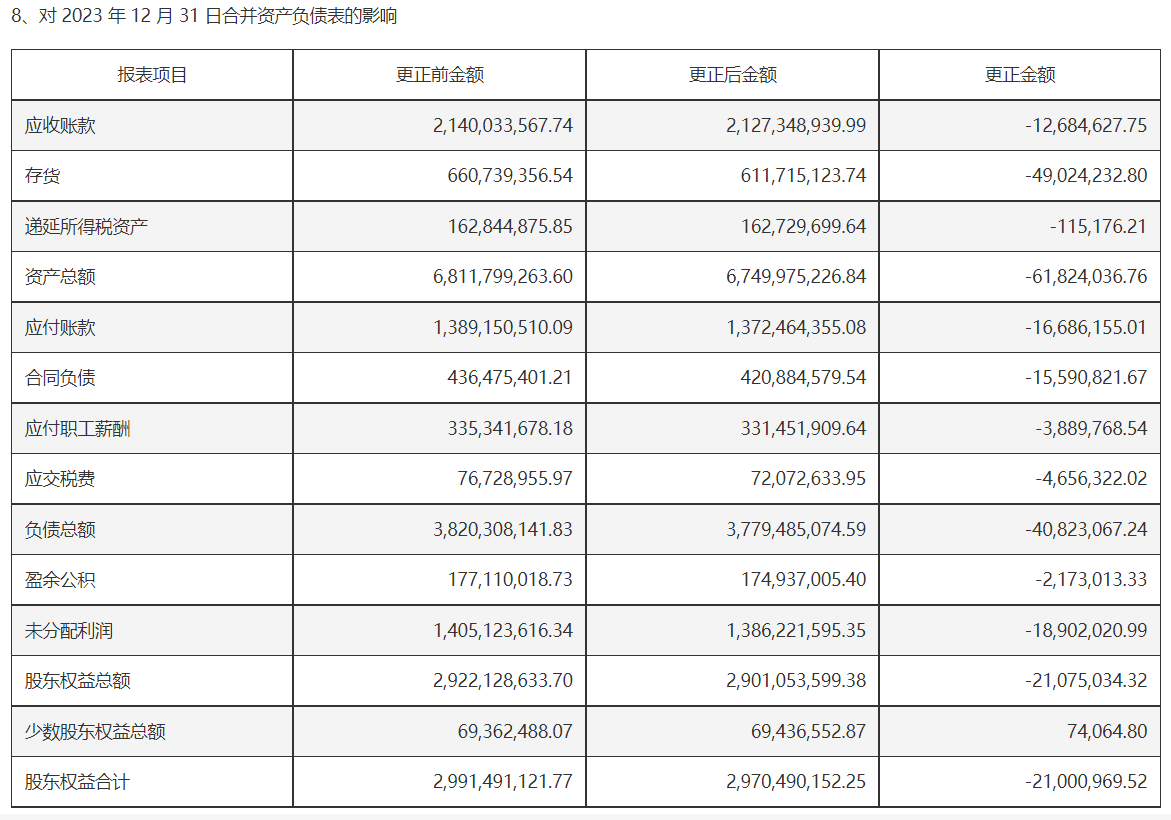设研院在11月26日的公告中表示,公司已完成了相关整改工作,并对2020年至2023年的会计差错进行了更正及追溯调整。根据10月31日发布的差错更正专项说明公告,各年度的财务报表均出现了不同程度的调整。例如,2020年年末合并资产负债表中,应付账款金额增加了62万元,负债总额减少了2515万元,资产总额减少了5804万元;而在合并利润表中,营业成本增加了1798万元,净利润则减少了1529万元。