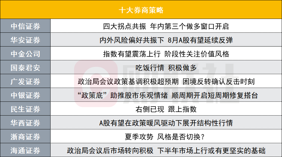 中信证券:认为8月将在政策、基本面、流动性、情绪四大拐点的共振下,开启年内第三个关键做多窗口,预计行情将在政策有序落地的过程中逐步上行,配置上建议关注房地产产业链、科技产业、能源资源产业。