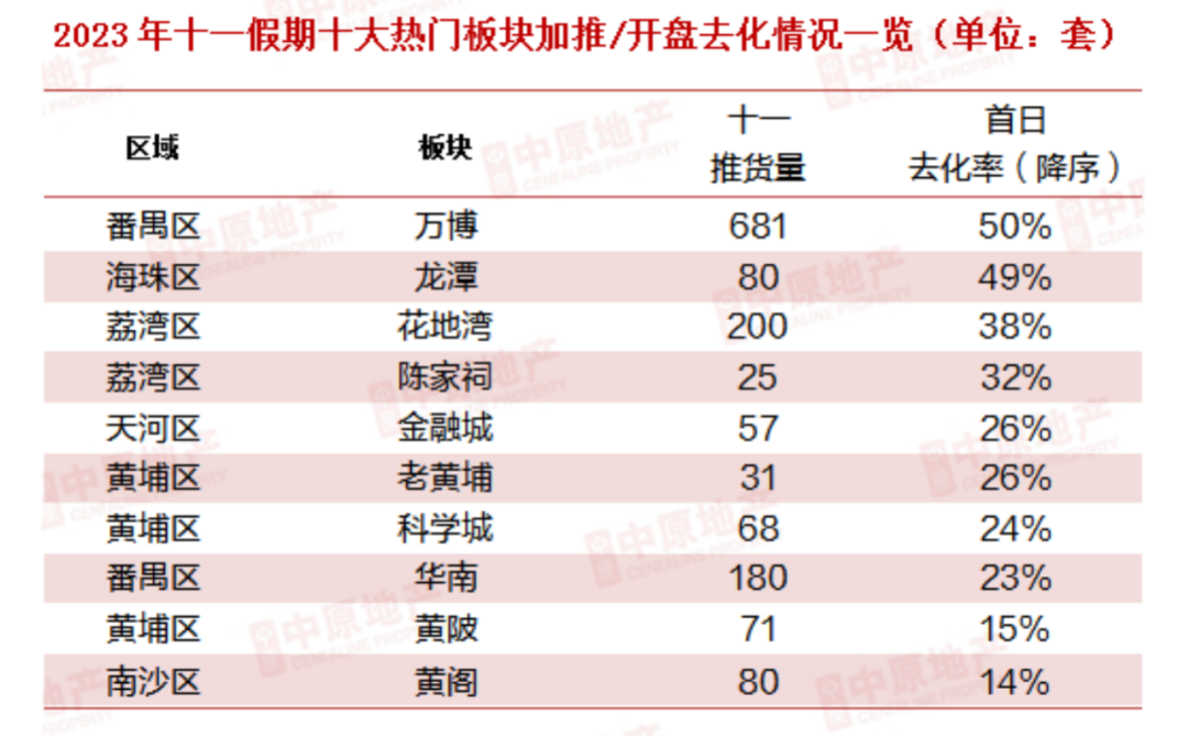据广州中原地产研究院数据,番禺区成为今年黄金周的热门区域,多个楼盘首日去化率超过30%。广州首日去化率较高的板块还包括番禺区万博板块、海珠区龙潭板块和荔湾区花地湾板块。