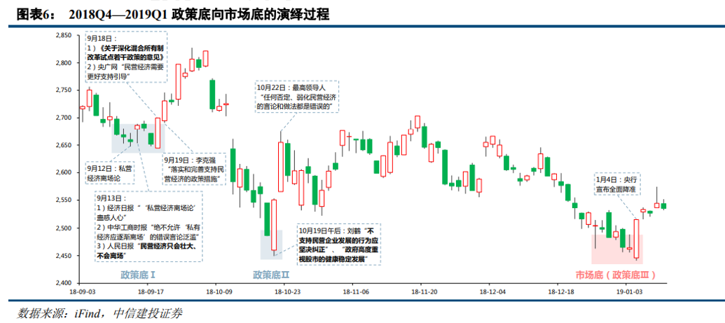 第一次是2018年9月13日开始,政府连续表态支持民营经济,市场的“国进民退”担忧有所缓解,第一个政策底得到确认,但市场随后再度回落探底。