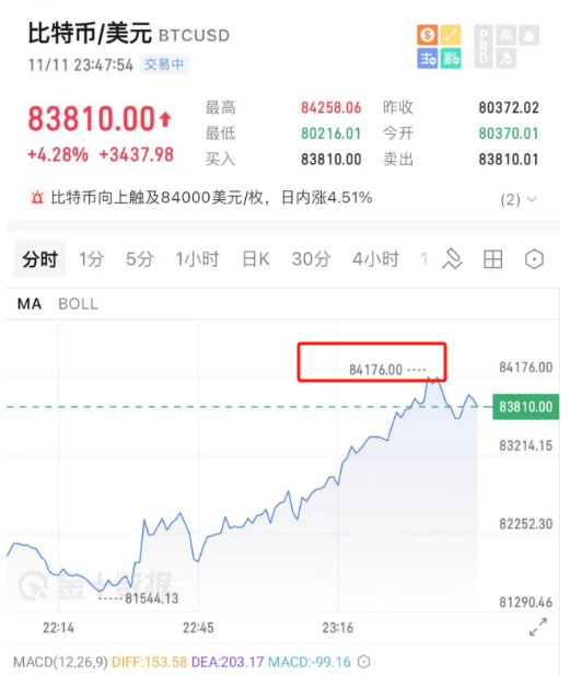 摩根士丹利财富管理首席投资官表示,共和党胜利点燃市场“动物精神”,但保持平衡立场。比特币首次突破84000美元,日内涨超5%,花旗策略师指出加密货币是“尚未回调的特朗普交易之一”,投资者期待特朗普政府对加密货币友好,带来监管明晰性。