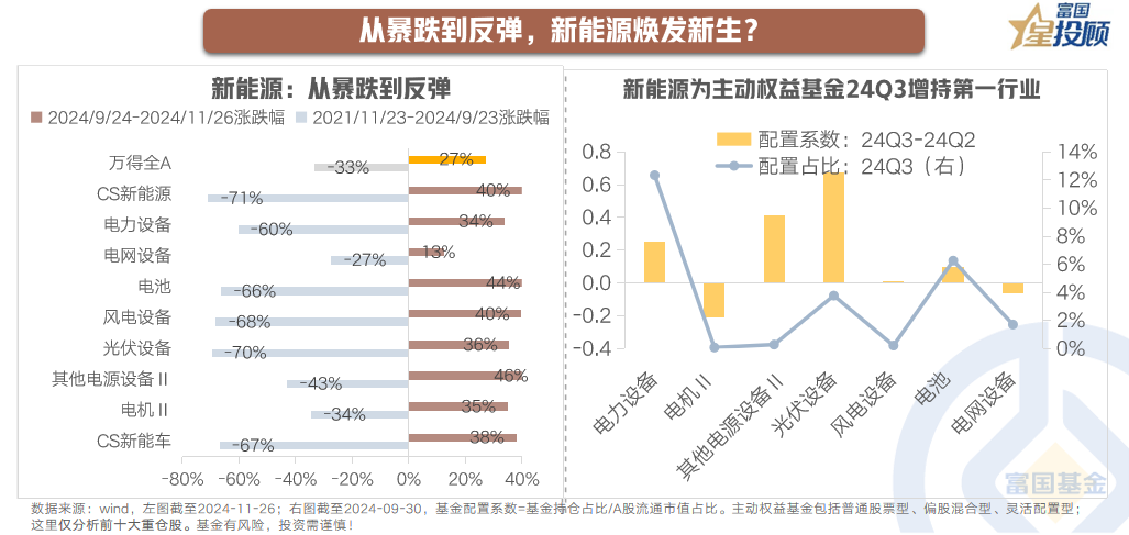 与此同时,从机构持仓动向来看,新能源已成为主动权益基金在2024年第三季度增持最多的行业。这既反映了市场情绪回暖下资金从防御型资产向成长型板块的转移趋势,也凸显了市场开始重新关注新能源各细分领域的积极变化。在经历了前几年的辉煌与回落后,新能源赛道似乎正迎来新的发展机遇。