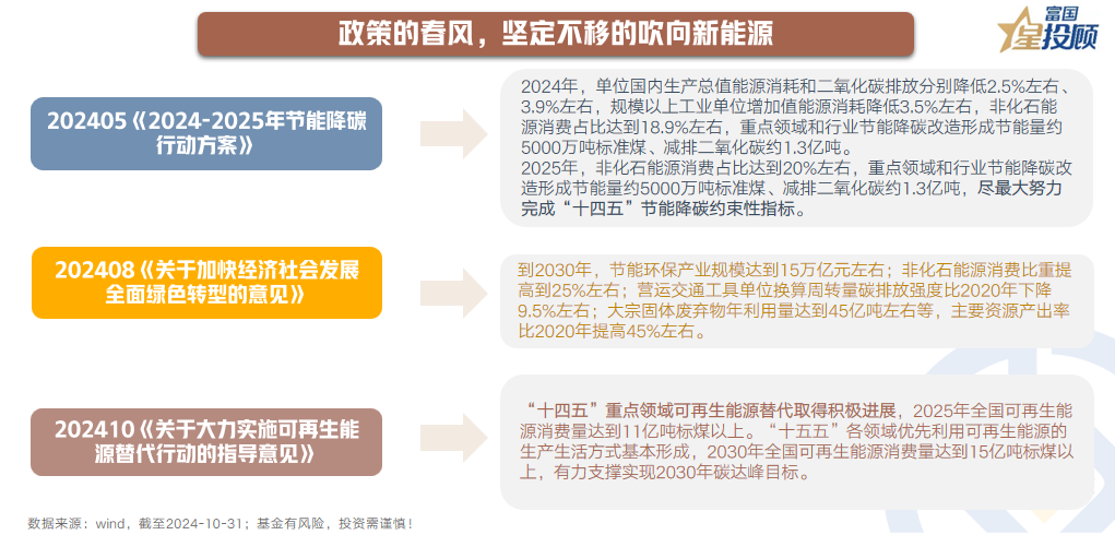 今年以来,新能源领域政策利好不断。从5月国务院发布的《2024-2025年节能降碳行动方案》,到8月中共中央、国务院印发的《关于加快经济社会发展全面绿色转型的意见》,再到10月末国家发改委等六部门推出的《关于大力实施可再生能源替代行动的指导意见》,这些政策充分体现了新能源在国家能源体系中的核心战略地位。展望未来,随着十四五规划的收官之年到来,为完成构建现代能源体系、推动能源低碳转型等目标,新能源有望迎来加速发展阶段。