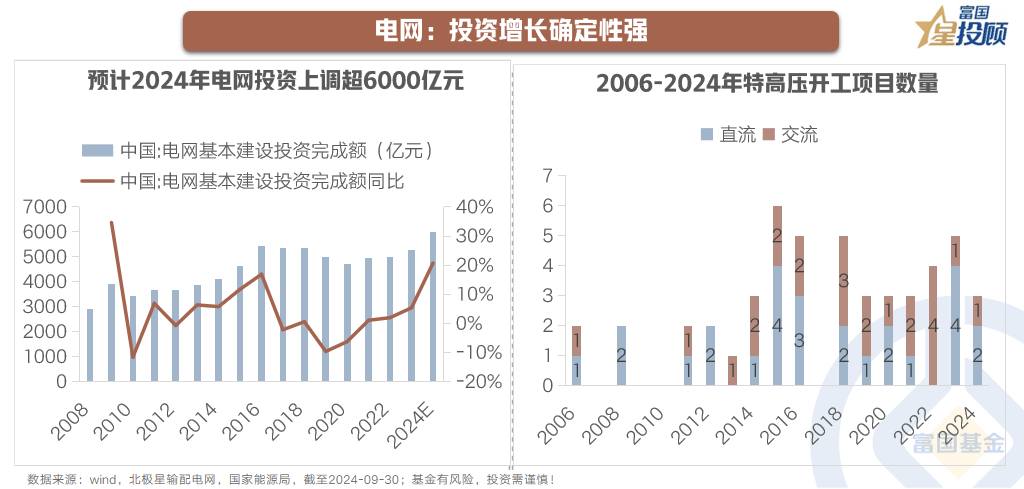 电网投资一直是逆周期调节的重要手段。2024年,国内电网投资规模上调至超过6000亿元,较上一年度增长超过700亿元。新增投资将主要用于特高压交直流工程建设、电网数字化智能化升级等领域。尽管受多重因素影响,2024年国内主网与特高压招标与开工进度略低于预期,但根据政策部署,后续特高压及配套主网建设有望加速推进。此外,随着新能源装机增加、电网老旧设备更换需求以及新兴市场渗透率提升,全球电网建设发展势头强劲,电力设备出海机遇值得关注。