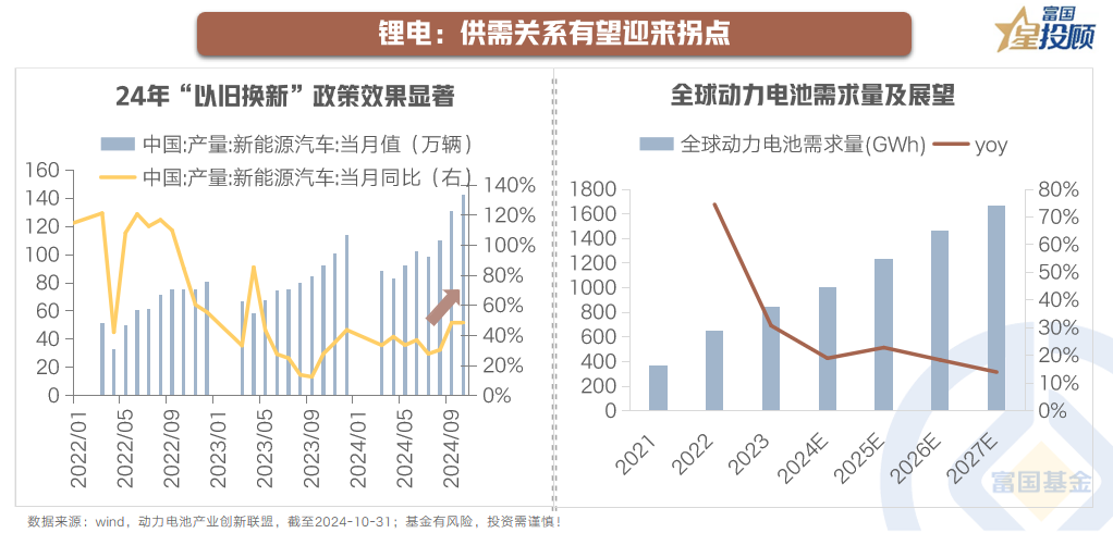 2024年“以旧换新”政策成效显著,新能源汽车产销持续攀升。10月,新能源汽车产销同比分别增长48%和49.6%,带动电池需求保持增长趋势。同时,商务部表示将提前谋划明年的汽车以旧换新接续政策,这意味着该政策将继续发挥积极作用。供给端方面,锂电产业链资本开支连续八个季度下行,产业链盈利中枢逼近亏损。然而,随着2025年国内与欧洲新能源车以及储能行业的拉动需求增长,锂电有望迎来供需形势的拐点,进入盈利修复区间。此外,在产能过剩引发的行业整合阶段,行业龙头的成本优势有望得到进一步增强。
