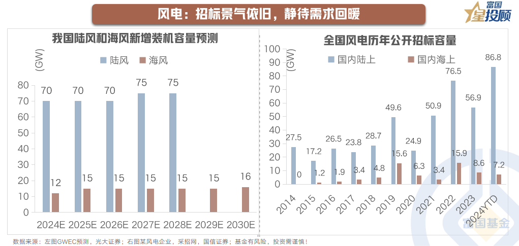 在海风方面,我国储备的海风项目众多,大部分近海项目有望在近两年内实现装机并网,未来两年海风板块具有良好发展前景。在陆风方面,随着“十四五”规划接近尾声,多个大基地项目启动风机招标,预计2025年新增陆风装机将具有较强增长动力。