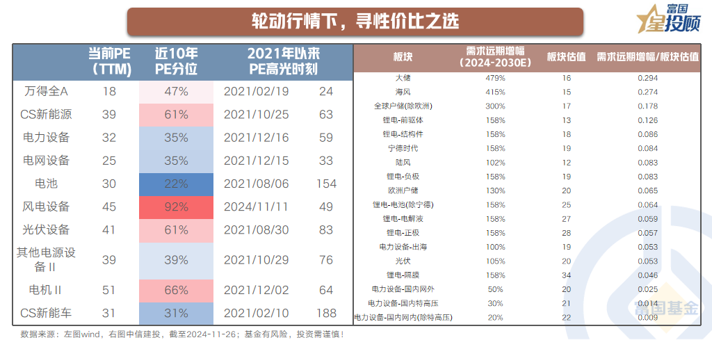 经过前期反弹后,中证新能源指数估值水平已回升至近十年60%左右的分位水平。当前,A股市场已由普涨阶段转向预期和现实博弈的分化阶段。在轮动为主的行情特征下,寻找低位板块进行布局成为更为稳妥的投资策略。结合新能源各细分板块远期需求增幅和估值对比来看,储能、海风以及锂电龙头在当前时点具有较高的性价比。