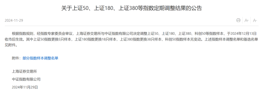 上交所于11月29日发布公告,宣布将调整上证50、上证180、上证380及科创50等指数样本,该决定由指数专家委员会审议通过,并将于2024年12月13日收市后正式生效。
