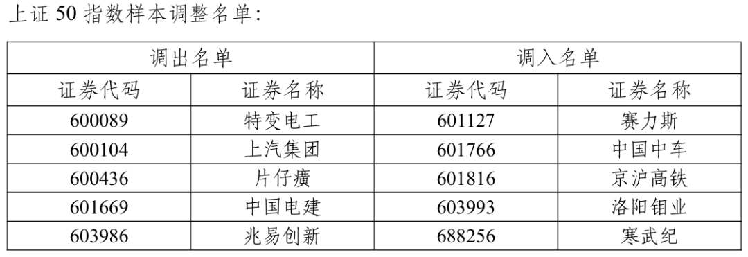 此次调整中,上证50指数更换了5只样本股,具体为调入赛力斯、中国中车、京沪高铁、洛阳钼业和寒武纪,而特变电工、上汽集团、片仔癀、中国电建和兆易创新则被调出。上证180指数和上证380指数分别更换了18只和38只样本股,科创50指数则保持样本稳定。
