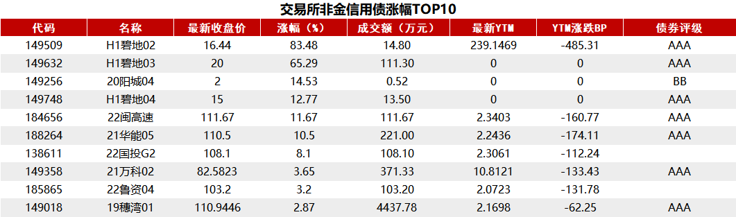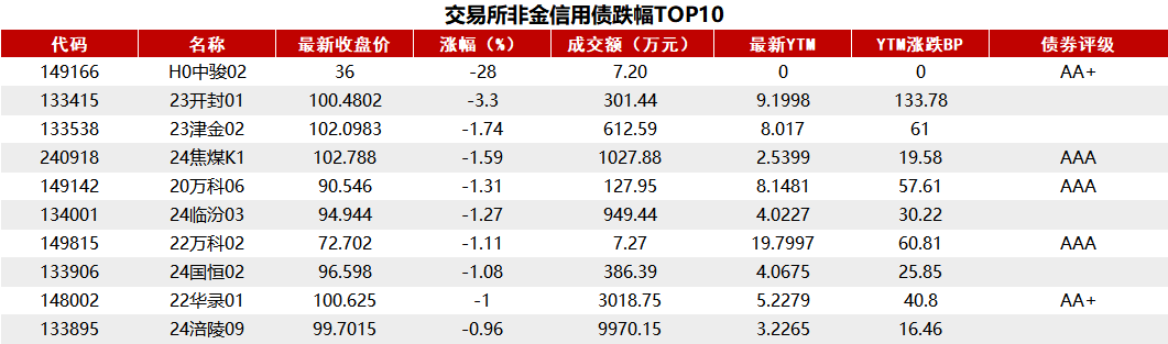Choice数据统计显示,今日交易所市场非金信用债跌幅排行前五的债券分别为H0中骏02、23开封01、23津金02、24焦煤K1和20万科06。同时,涨幅排行前五的债券分别为H1碧地02、H1碧地03、20阳城04、H1碧地04和22闽高速。