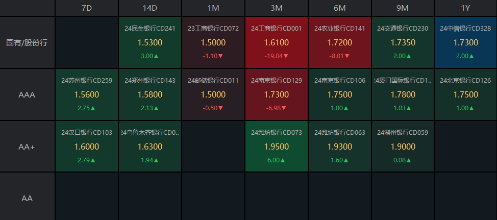 在存单市场方面,今日3个月期国股存单需求较好,报价在1.61%-1.76%之间,较前一日下行19bp;而1年期国股存单报价在1.7%-1.74%之间,较前一日上行2bp。AAA级存单方面,9个月期成交在1.78%,1年期成交在1.75%的位置。