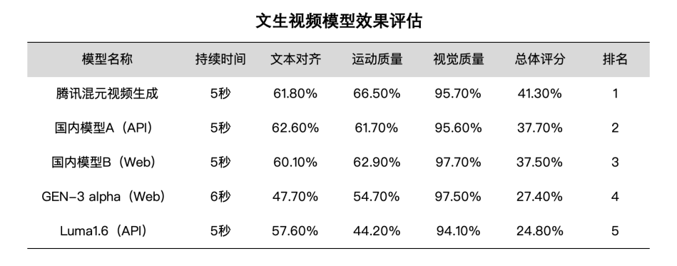 腾讯将混元视频生成大模型与国内外多个顶尖模型进行了评测对比,结果显示,腾讯的模型在文本视频一致性、运动质量和画面质量等多个维度上均表现出色,特别是在人物、人造场所等场景下,其优势更为明显。