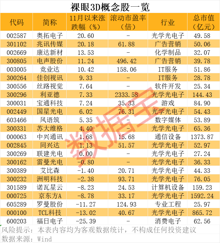 据证券时报·数据宝统计,共有23家A股上市公司布局裸眼3D技术,主要集中在光学光电子行业,其他还有广告营销、数字媒体等行业上市公司。自11月以来,概念股平均上涨2.38%,其中奥拓电子、兆讯传媒等累计涨幅超过10%。从估值来看,剔除负值后相关概念股的滚动市盈率明显高于A股平均水平,中位数超过50倍。