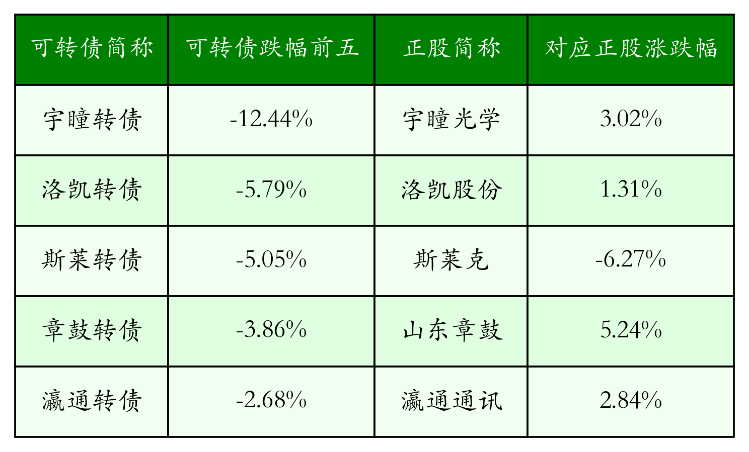 另一方面,市场亦存在波动,有7只可转债跌幅超过2%,其中宇瞳转债 (123219)领跌,跌幅为12.44%;洛凯转债 (113689)和斯莱转债 (123067)分别下跌5.79%和5.05%,显示出市场一定的调整压力。