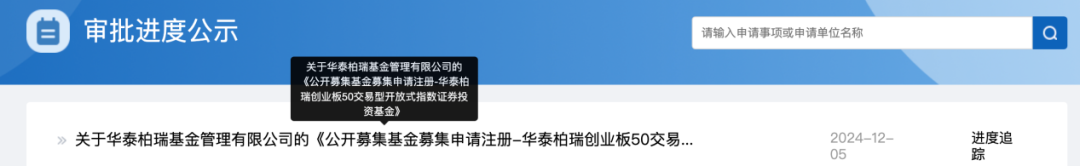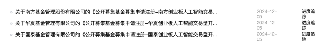 12月5日,证监会网站最新消息显示,当日,华夏、南方、华泰柏瑞、国泰四家基金公司集中上报了创业板主题ETF产品。具体而言,南方基金、华夏基金和国泰基金均上报了创业板人工智能ETF,而华泰柏瑞基金则上报了创业板50ETF,申请材料均已被证监会接收。