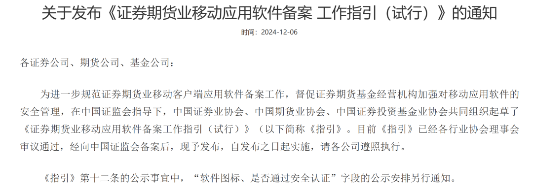 12月6日,为规范证券期货业移动客户端应用软件(App)备案工作,中国证券业协会、中国期货业协会、中国证券投资基金业协会在中国证监会指导下,共同发布了《证券期货业移动应用软件备案工作指引(试行)》(简称《指引》),并于发布之日起实施。