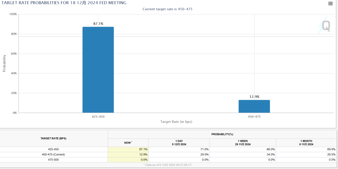 同样在12月6日晚间,美国劳工统计局公布数据显示,11月非农就业人数增加22.7万人,但增速较今年早些时候放缓,失业率微升至4.2%,长期失业人数达近三年来最高水平。这一数据进一步支持了美联储本月晚些时候再次降息的预期。美联储主席鲍威尔此前表示,9月的降息是为了向市场发出强烈信号,支持劳动力市场。目前,交易员加速押注降息,市场隐含概率显示12月18日美联储降息25个基点的可能性已超过87%。高盛资产管理公司等多位专家表示,尽管价格压力仍高,但美联储有望在12月实现降息,但后续降息步伐可能会放缓。