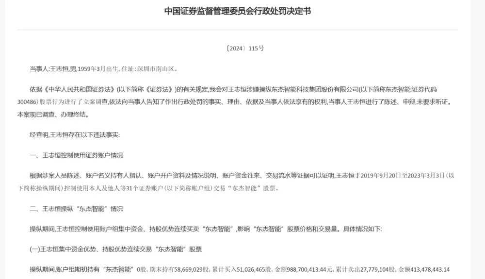 一位65岁的深圳股民王志恒,因操纵股票市场而遭受重大损失,并面临证监会的高额罚款。证监会公开的行政处罚决定书揭示了其操纵股票“东杰智能”的详细情况。