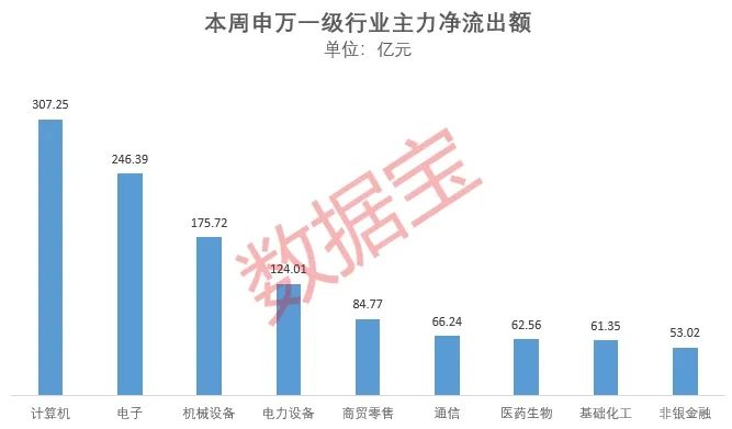 多数申万一级行业遭遇主力资金撤离。其中,计算机、电子、机械设备、电力设备行业一周主力资金净流出金额居前,分别高达307.25亿元、246.39亿元、175.72亿元和124.01亿元。相比之下,石油石化、煤炭、钢铁、银行等行业则获得主力资金逆势加仓,其中钢铁和银行行业一周主力资金净流入额均超过5亿元。