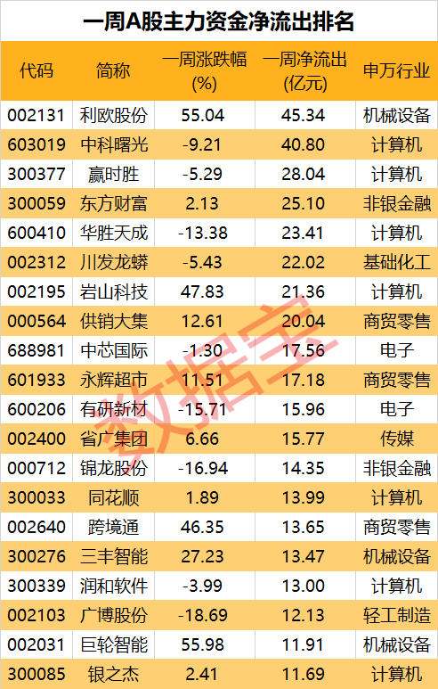 利欧股份、中科曙光净流出额居前,均超过40亿元;赢时胜、东方财富、华胜天成、川发龙蟒等个股紧随其后,净流出额均超过20亿元。尽管利欧股份作为AI营销概念的热门股在今日盘中再度涨停并触及新高,但主力资金本周却持续出逃。