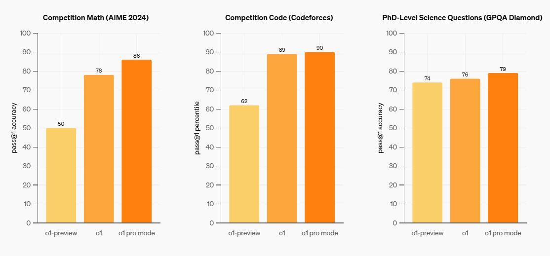 在数学、科学和编码等具有挑战性的机器学习(ML)基准测试中,o1 pro mode的表现均优于o1和o1-preview。在数学方面,o1 pro mode得分为86,o1和o1-preview分别为78和50;在编码方面,o1 pro mode得分为90,o1和o1-preview分别为89和62;在回答博士级别的科学问题时,o1 pro mode得分为79,后两者分别为76和74。