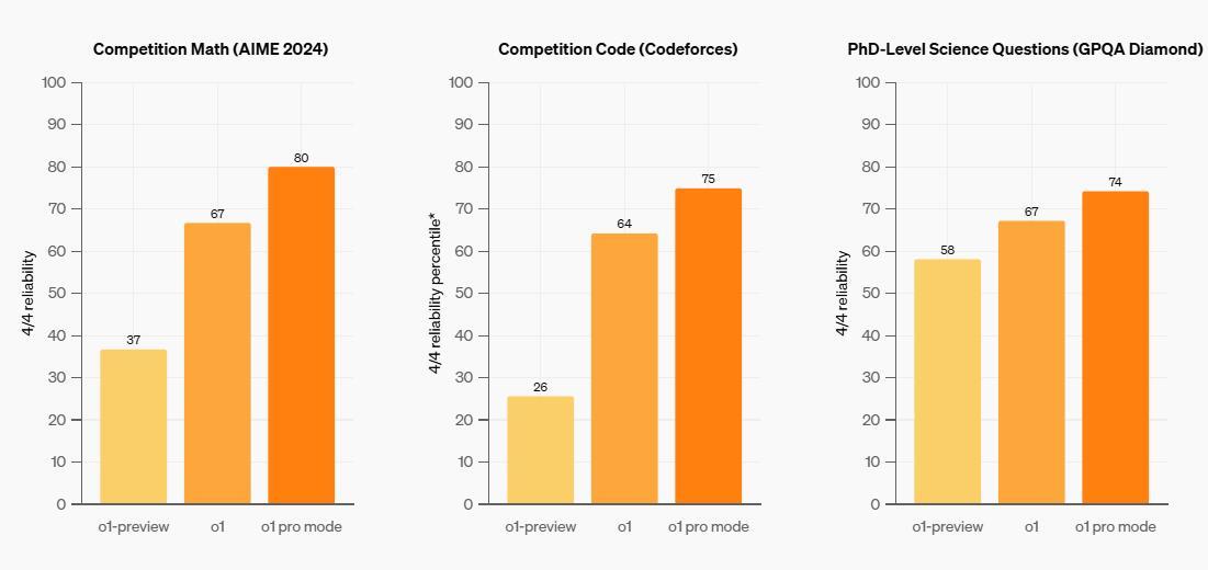 为了凸显o1 pro mode的可靠性优势,OpenAI提高了评估标准,要求模型在四次尝试中全部正确回答问题才算成功。即使在这种高标准下,o1 pro mode的表现依然明显优于o1和o1-preview。在四次必须全部答对的情况下,o1 pro mode在数学方面得分为80,o1和o1-preview分别为67和37;在编码方面得分为75,后两者分别为64和26;在回答博士级别的科学问题时得分为74,后两者分别为67和58。
