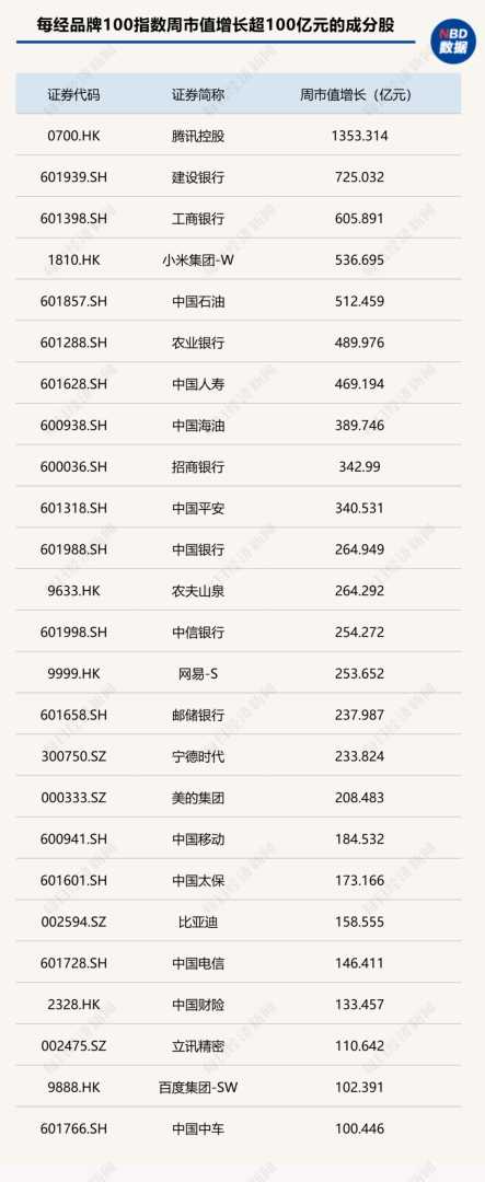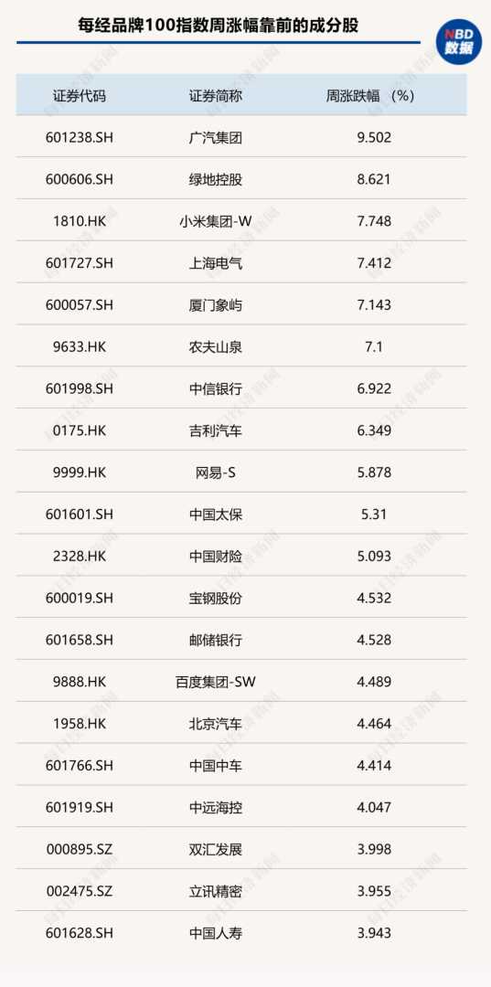 在港股市场方面,本周每经品牌100指数成分股中,港股整体表现强势。广汽集团和绿地控股涨幅分别高达9.5%和8.62%,小米集团、上海电气、厦门象屿以及农夫山泉涨幅也均超过7%。此外,腾讯控股市值增长高达1353.31亿元,显示出其强大的市场影响力。