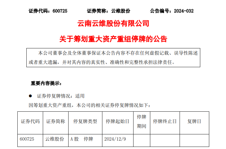 鉴于交易尚处于筹划阶段,具体事项尚存不确定性,为确保信息公平披露并维护投资者利益,云维股份自12月9日(星期一)起停牌,预计停牌时间不超过10个交易日。