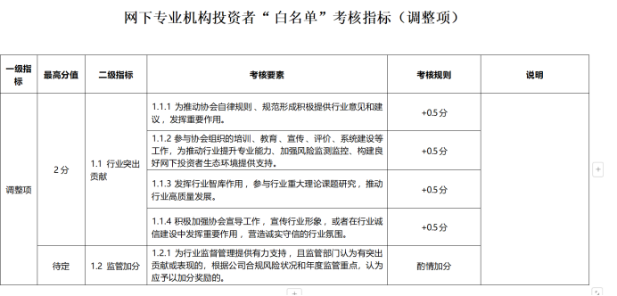 中证协将受理符合条件的网下专业机构投资者的申请,并发放调查问卷,按照《网下专业机构投资者“白名单”考核指标》进行筛选,将符合条件的机构列入“白名单”。申请主体的基准分为100分,中证协将根据业务类型、业务开展状况、人员队伍建设、合规风控等方面的情况进行加分或扣分,以确定最终得分。加分项包括推动行业发展、作出突出贡献等。