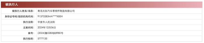 据中国执行信息公开网最新消息,12月6日,青岛天际汽车零部件制造有限公司新增两则被执行人信息,执行标的总额高达7965万余元。值得注意的是,其中一起案件的被执行人还牵涉天际汽车(长沙)集团有限公司,而这两起案件的执行法院均为平度市人民法院。