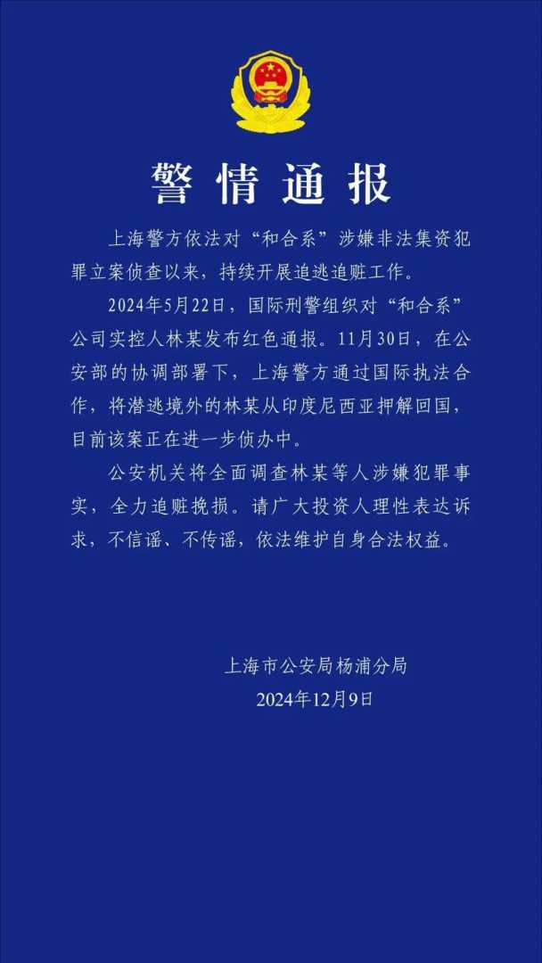 12月9日,上海市公安局杨浦分局发布警情通报称,自依法对“和合系”涉嫌非法集资犯罪立案侦查以来,警方持续开展追逃追赃工作。2024年5月22日,国际刑警组织对“和合系”公司实控人林某发布红色通报。11月30日,在公安部的协调部署下,上海警方通过国际执法合作,成功将潜逃境外的林某押解回国。